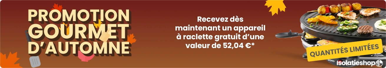 Isolatieshop ne livre pas l’appareil à raclette ultérieurement. Le client doit ajouter lui-même l’article à sa commande en utilisant le code « GOURMETSTEL ». -