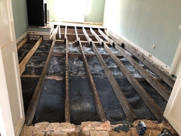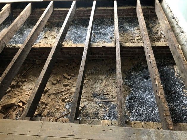 In onderstaand voorbeeld is te zien wat bewoners aantroffen tijdens de verbouwing van hun huis. De HR++ Isolatieparels waren niet evenredig onder de vloer verdeeld. De voorste zones onder de vloer waren wel gevuld, maar achterin helaas niet. Op de foto's is te zien dat dit waarschijnlijk kwam door de tussenmuren onder de vloer. Zorg er dus voor dat de parels een mogelijkheid hebben om zich onder uw totale vloer te verspreiden.